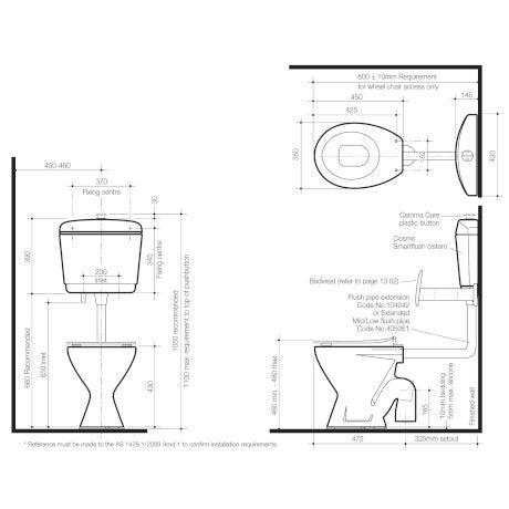 The Care 100 toilet suite with Backrest is a pedestal type 4.5/3 litre dual flush suite designed to provide extra support for people with disabilities with a raised seat height of between 460-480mm, backrest and raised height buttons. The simplistic versatility of the Care 100 suite makes it ideal for use by those with disabilities and wheel-chair users including wheeled commode chairs.