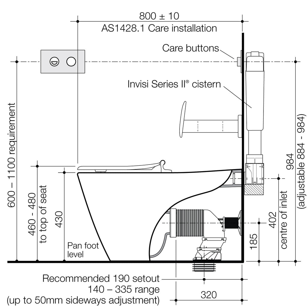 The Caroma Care 800 Cleanflush® range is ideal for hospital, aged care and commercial applications where the absolute highest levels of hygiene and rapid cleaning are required. The Care 800 Cleanflush® Invisi Suite with Backrest in particular features a raised height seat, an increased pan projection and backrest specifically designed to provide extra support for people with disabilities and applications requiring compliance to AS1428.1 Design for Access & Mobility.