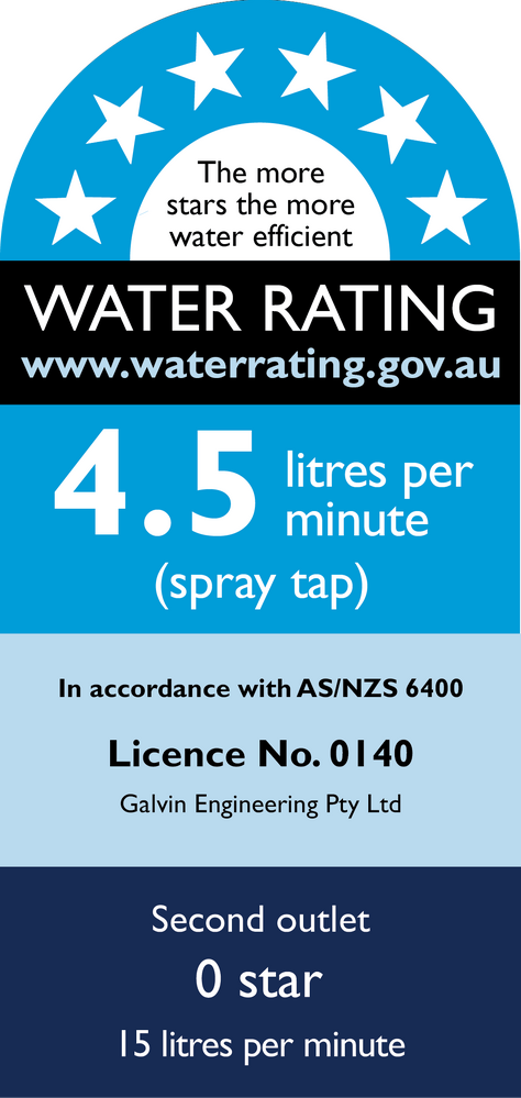 WELS: 0 Star Rating (15L/min) - WaterMark: AS/NZS 3718 Lic. WMKA0034