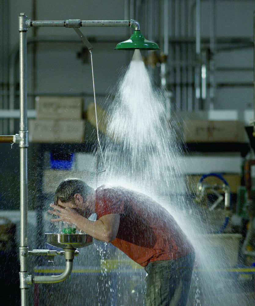 Eye/face wash valve is designed to make the flushing of contaminants occur with the simple push of a stainless steel flag. Shower ball valve is designed to make the flushing of fluid occur with the pull of a triangular lever. Both are made of type 316 stainless steel.