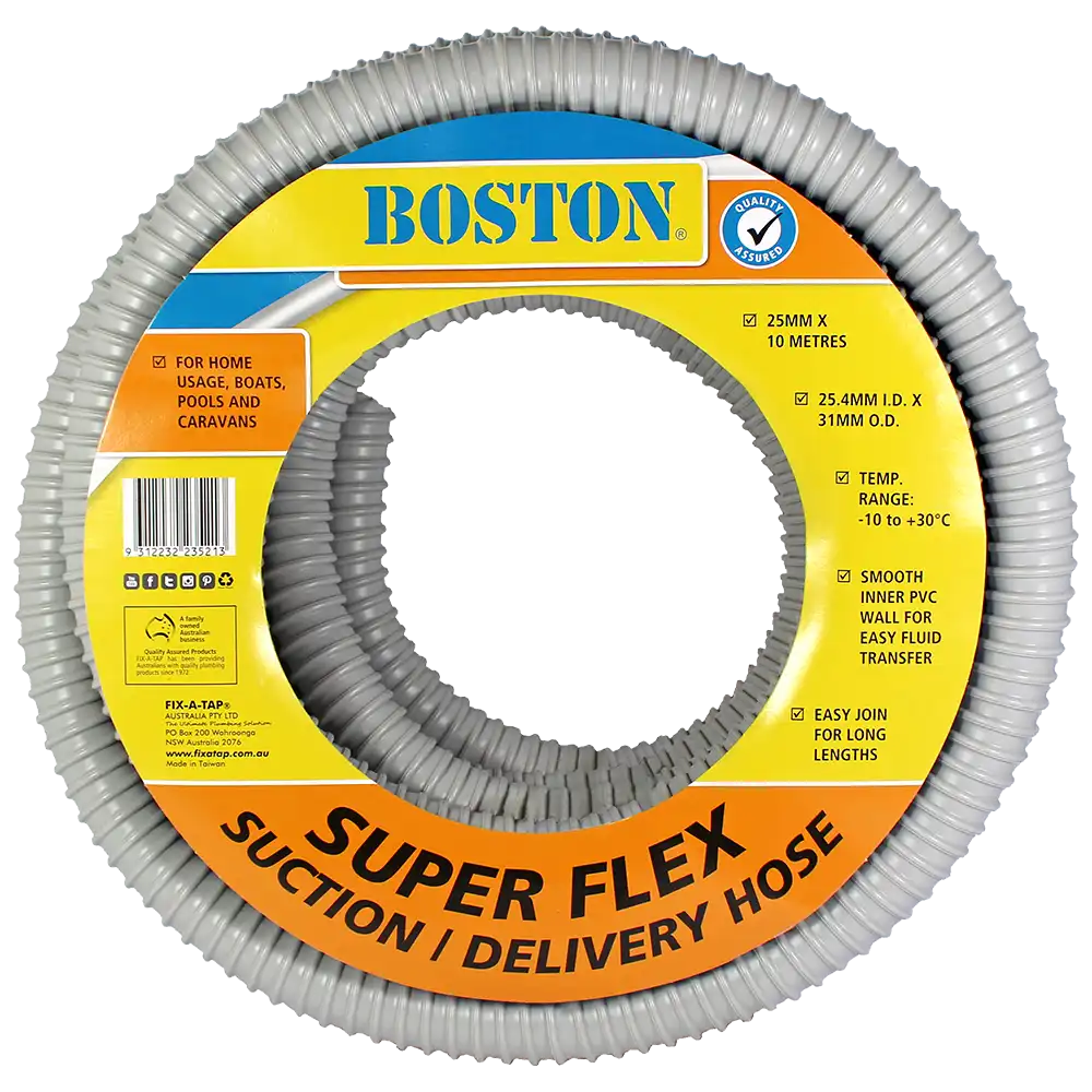 The BOSTON 25mm x 10m Super Flex Suction Delivery Hose is designed for homes, boats, pools & caravans and recycles waste water from washing machines. This 1″ hose is easy to join for longer lengths, and features a smooth inner PVC wall for easy fluid transfer. Suction tubing dimensions; 25mm x 10 metres. 25.4mm I.D. x 31.4mm O.D. Temperature range: -10 to +30 degrees Celsius.