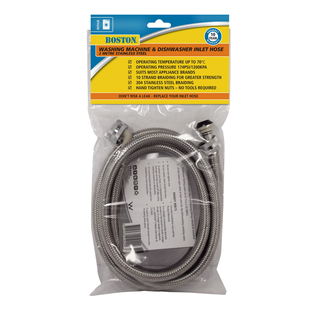 The 2 metre BOSTON stainless steel inlet hose is made from premium 10 strand, 304 stainless steel braiding for greater strength. No tools required – hand tighten premium grade round nickel plated brass female nuts are fitted at both ends to suit 3/4″ BSP threads. Suits most washing machine and dishwasher brands. Suits hot and cold water with an operating temperature of up to 70 Degrees Celsius, perfect for high temperature cycles. High operating pressure of 174 psi/1200kPa means less risk of a burst. 10.5mm inner hose diameter. Our BOSTON stainless steel inlet hoses feature a 10 year warranty for your peace of mind.